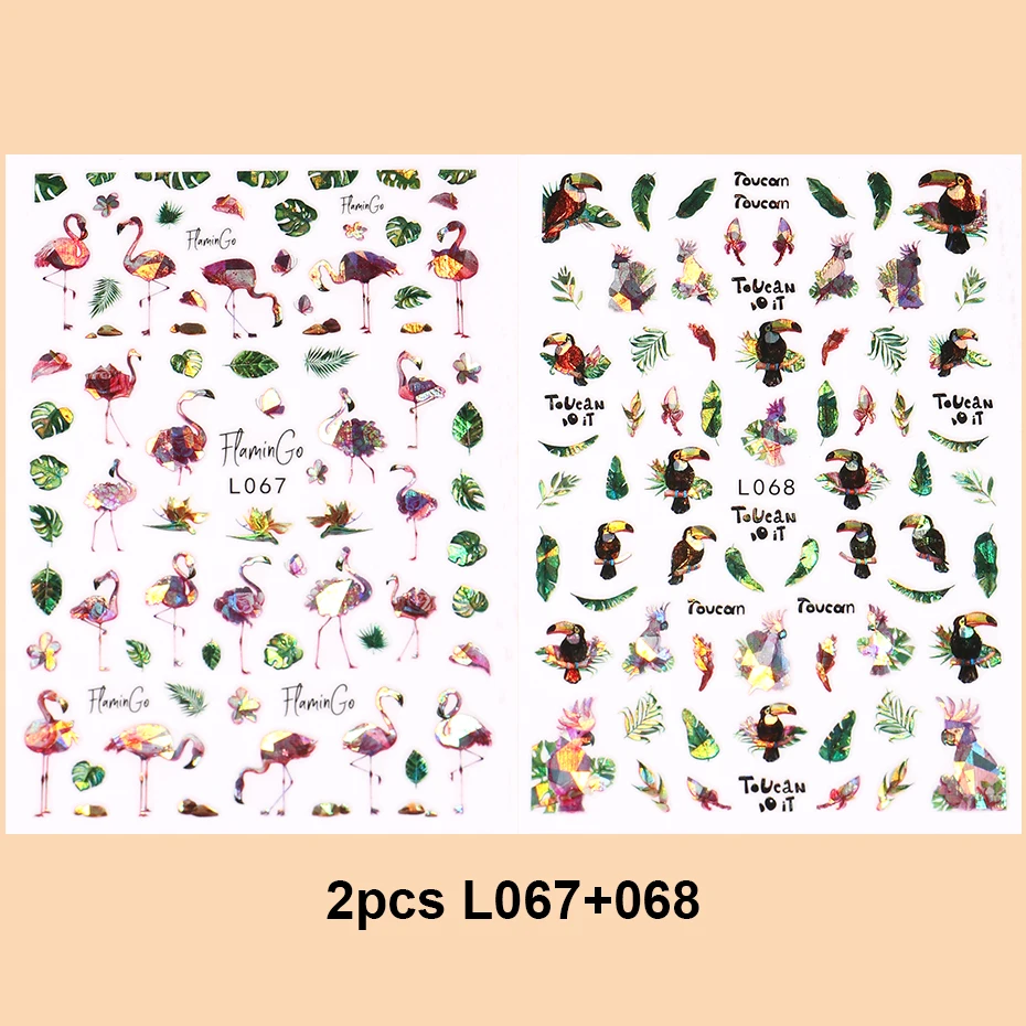 2pcs 3D Laser Summer Tropical Nail Stickers Shiny Pink Flamingos Woodpeckers Palm Leaves Designs Adhesive Decals Manicure Foils